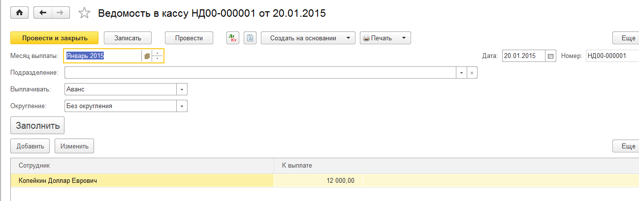 3. Сформировать Ведомость в кассу.