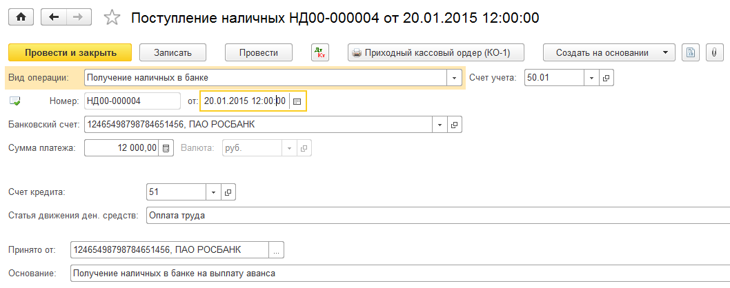 4. Получить наличные в банке на выплату аванса.