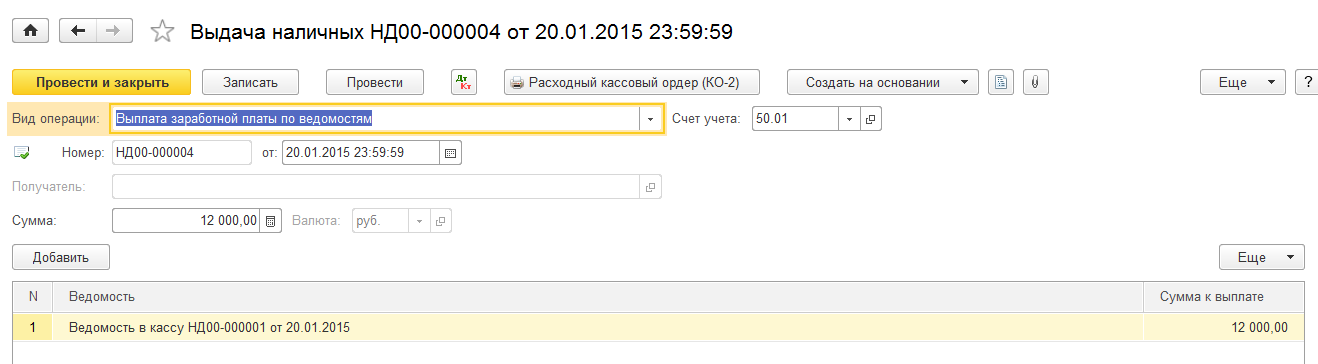 Для решения выплаты зарплаты с помощью одного РКО по всей ведомости или выплаты через банк достаточно на основании документа «Ведомость в банк/кассу» ввести соответствующий документ.