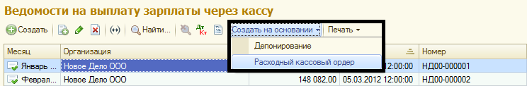 Аналогично документ «Депонирование» можно ввести на основании документа «Ведомость в кассу».