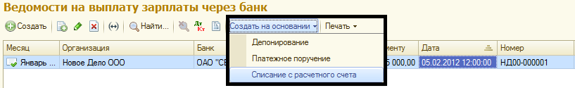 Аналогично данные документы можно ввести на основании документа «Ведомость в банк»:
