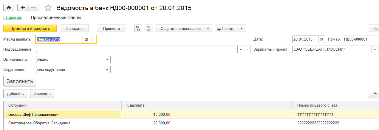 1. Сформировать Ведомость в банк