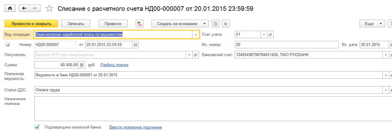 2. Оплатить ведомость документом Списание с расчетного счета (ввести на основании)