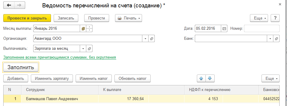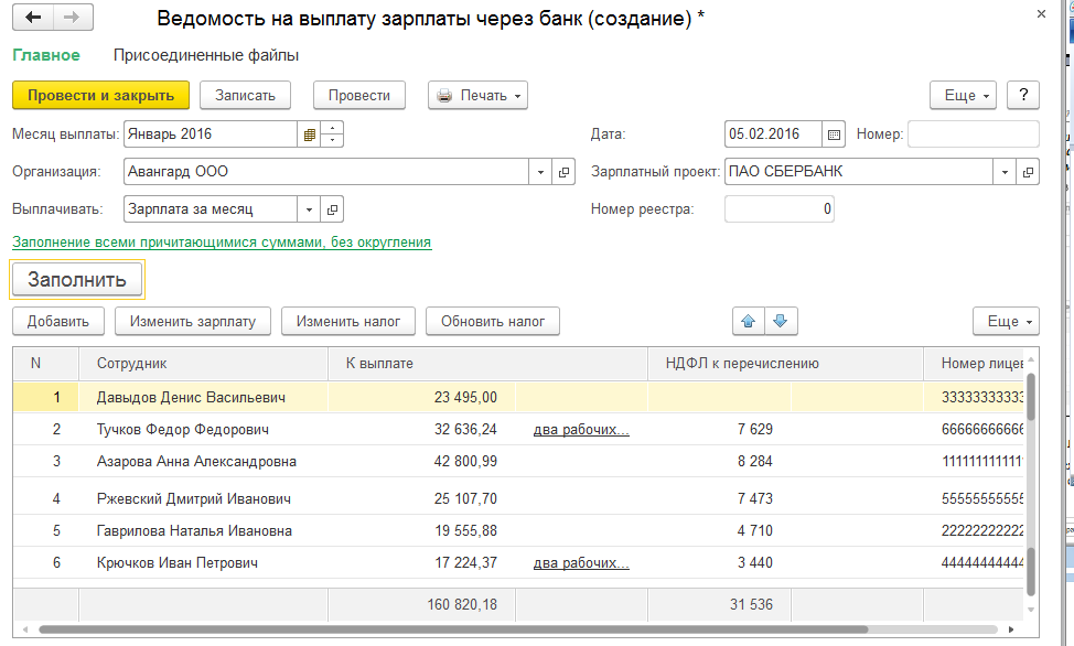 - Создадим и проведем ведомость на перечисление по лицевым счетам через Сбербанк для ООО "Авангард".