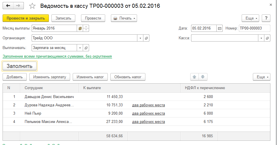 - Создадим и проведем ведомость на выплату зарплаты через кассу для сотрудников ООО "Трейд" (конкретную кассу указывать не будем – ведомость должна автоматически заполниться сотрудниками, получающими зарплату во всех кассах).