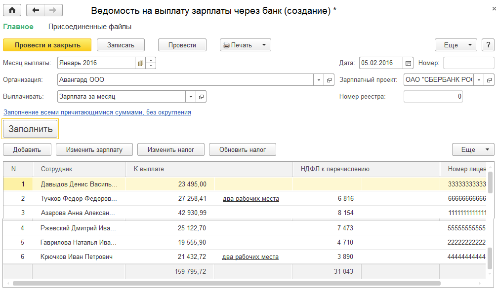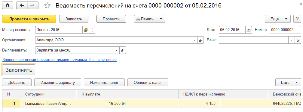 2. Создадим и проведем ведомость на перечисление по лицевым счетам через Сбербанк для ООО "Авангард".