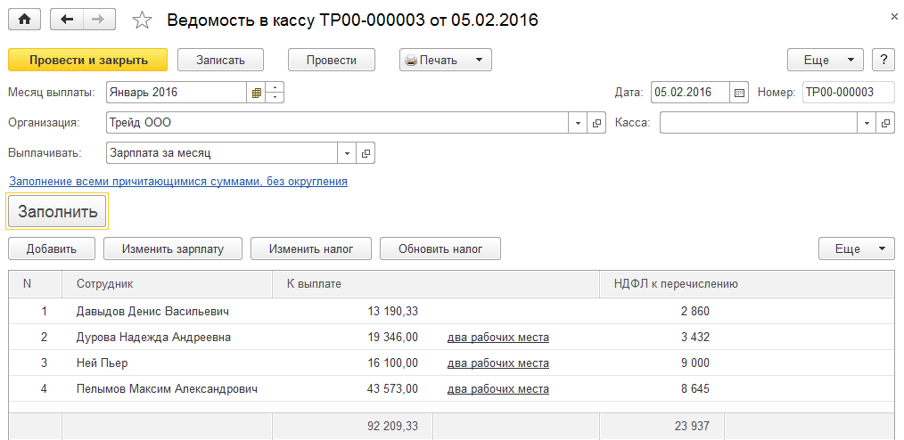 3. Создадим и проведем ведомость на выплату зарплаты через кассу для сотрудников ООО "Трейд" (конкретную кассу указывать не будем – ведомость должна автоматически заполниться сотрудниками, получающими зарплату во всех кассах).