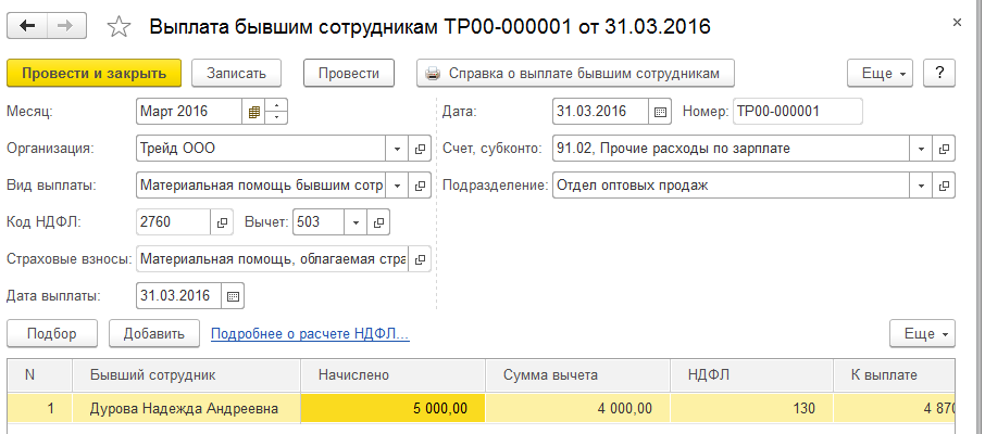 Бывшей сотруднице ООО "Трейд" Дуровой Н.А. в марте начислена материальная помощь как бывшему работнику. Зарегистрируем доход с помощью документа "Выплата бывшим сотрудникам", создав его из раздела "Выплаты/ Незарплатные доходы". Обратите внимание, что т.к. данный сотрудник получает такой доход впервые, его необходимо выбрать из полного списка сотрудников.