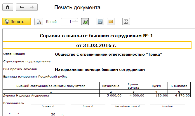 Проведем документ. Выведем на печать справку о выплате бывшим сотрудникам.
