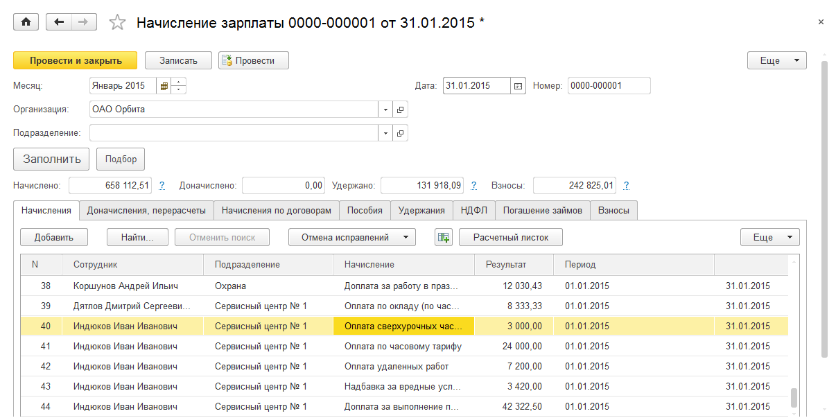 Выполним начисление заработной платы по ОАО Орбита