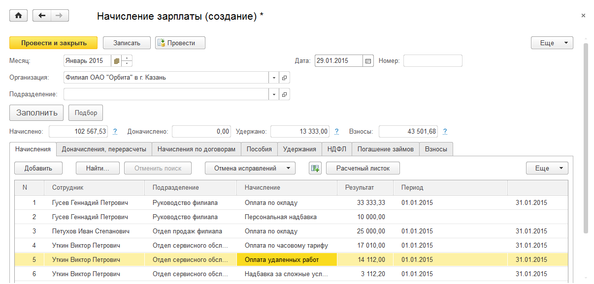 Отдельным документом выполняется Начисление зарплаты по Филиалу ОАО "Орбита" в г. Казань