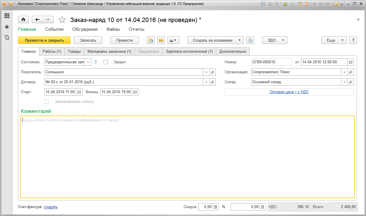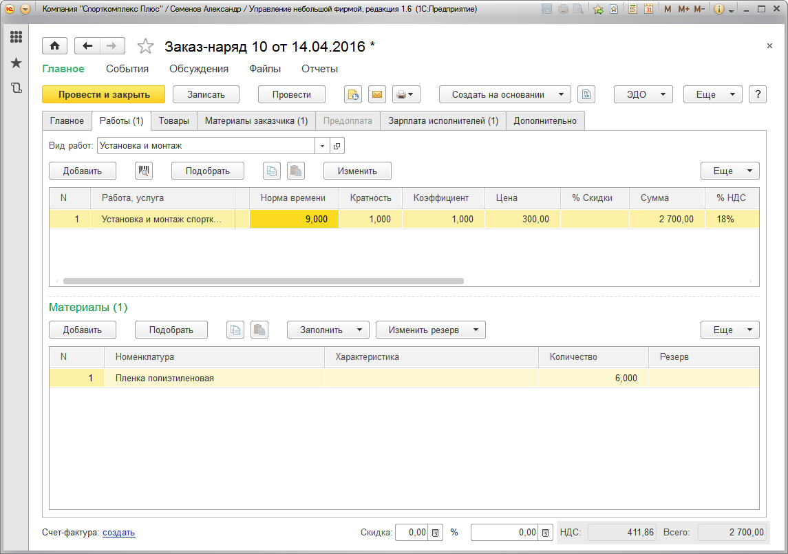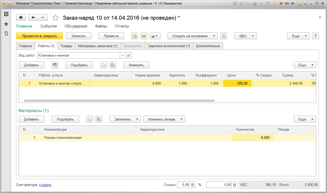 Теперь проводим документ "Заказ-наряд" и отражаем состоявшуюся продажу (факт приема работ заказчиком). Все, на этом цепочка завершена.