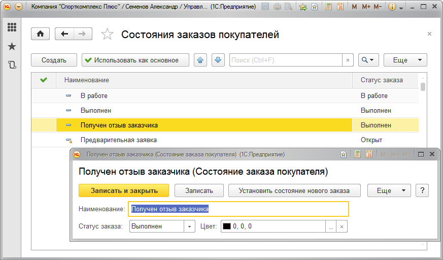 Подводим итог. Практически всю цепочку выполнения работ для заказчика мы отражали одним и тем же документом – "Заказ-наряд", который менял свое состояние на протяжении этой цепочки. Значение реквизита "Состояние заказа" для документа "Заказ-наряд" играет ключевую роль и фактически определяет, что происходит в программе при проведении документа: