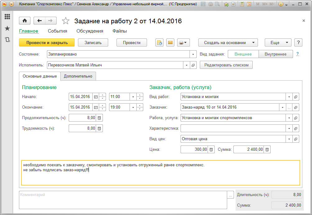 Рис. 72. Задание исполнителю работ