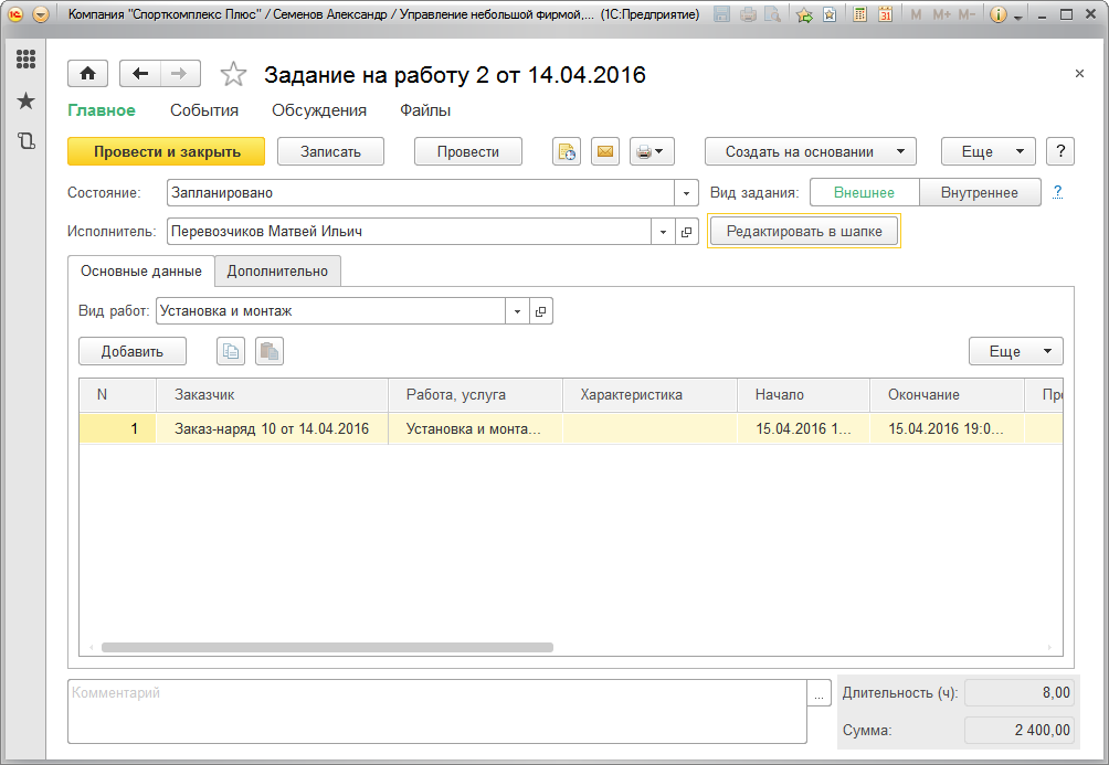 Итак, заказ наряд прошел предварительную обработку и отправился на исполнение. Необходимо выдать задание исполнителям. Введем документ "Задание на работу" (Рис. 72).