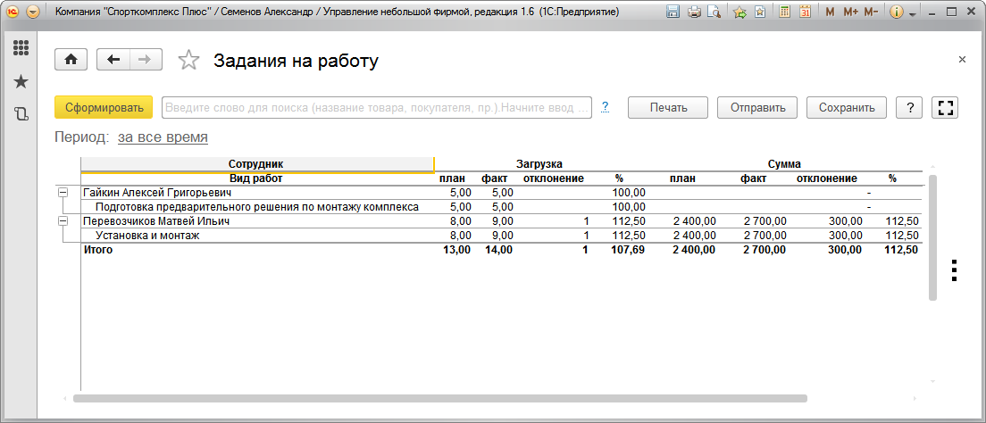 Для контроля и анализа планируемого и затраченного времени на выполнение работ предназначен отчет "Задания на работу", доступный в разделе "Сервис". В примере, показанном на Рис. 75, сотрудник Перевозчиков потратил 9 часов на установку и монтаж вместо запланированных 8 часов. Подобные ситуации должны быть предметом регулярного анализа. Тем более что данная работа является оплачиваемой заказчиком (в отчете присутствуют суммы, помимо количества), а значит – мы недополучили возможно от заказчика сумму, равную стоимости одного часа работы. Если это действительно так (сотрудник отработал больший объем работ, и заказчик принял его), то заказчику надо бы оформить дополнительный заказ-наряд на 1 час работ и выставить счет. Хотя в можно поступить и проще – внести изменение в существующий заказ-наряд, благо он еще не закрыт.