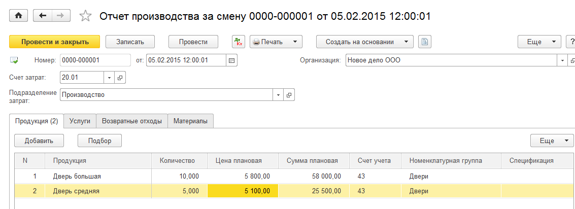При проведении документа следует обратить внимание на формируемые им проводки. Документ формирует столько проводок, сколько позиций выпускаемой продукции указано в документе. При этом в проводках указывается и количество, и обязательно плановая цена продукции.