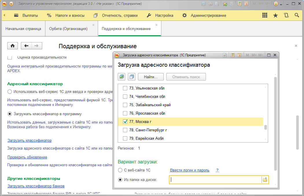 Для дальнейшего корректного заполнения адресов необходимо загрузить в программу адресный классификатор для региона 77 - Москва
