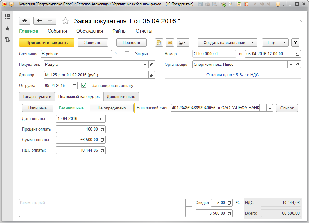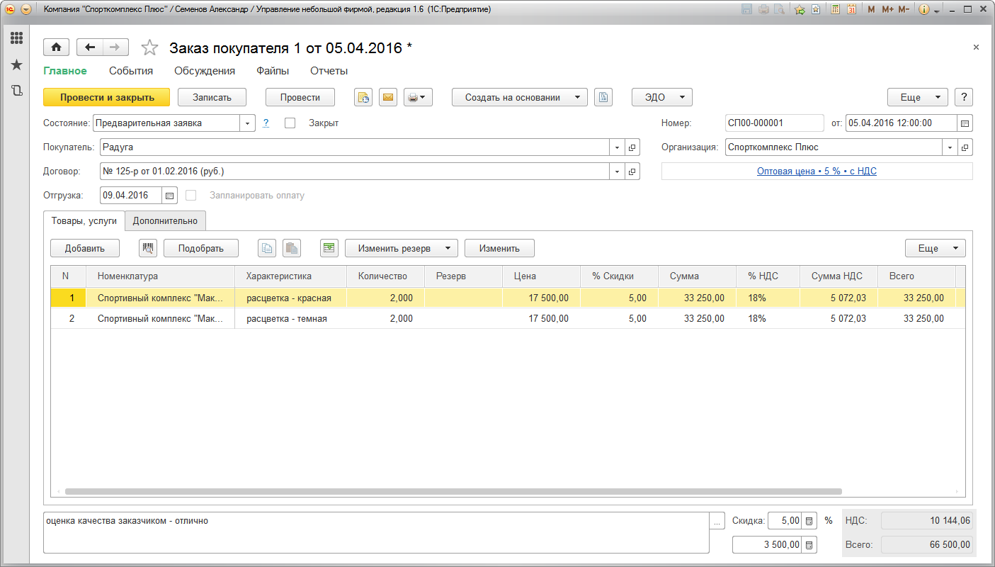 Рис. 41. Заказ покупателя, вкладка "Главное"
