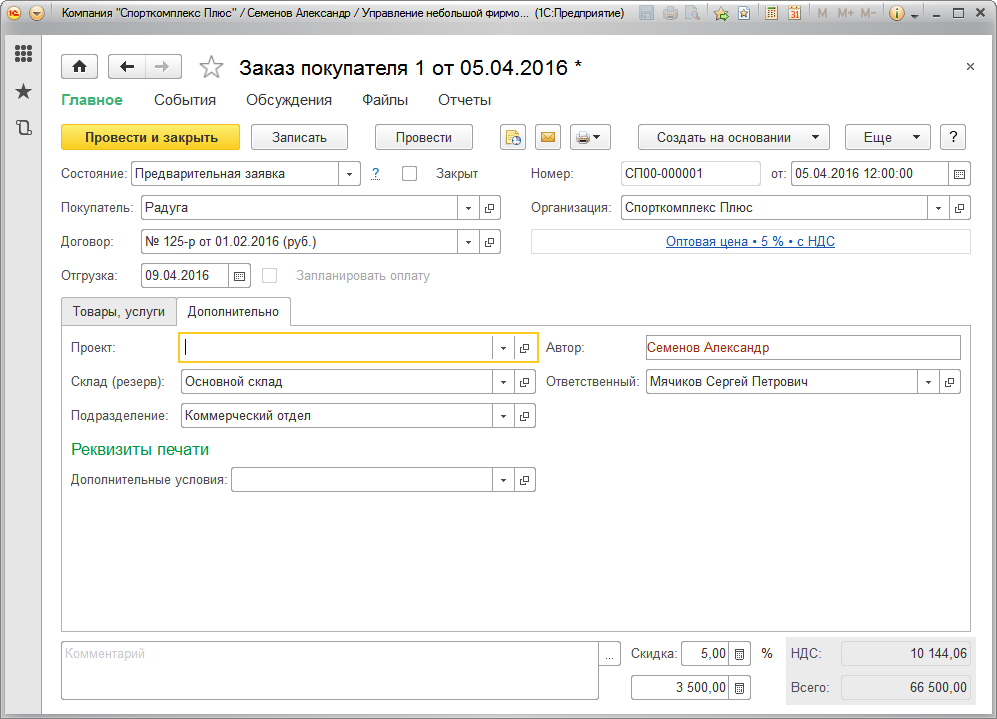 Рис. 44. Заказ покупателя, вкладка "Дополнительно"