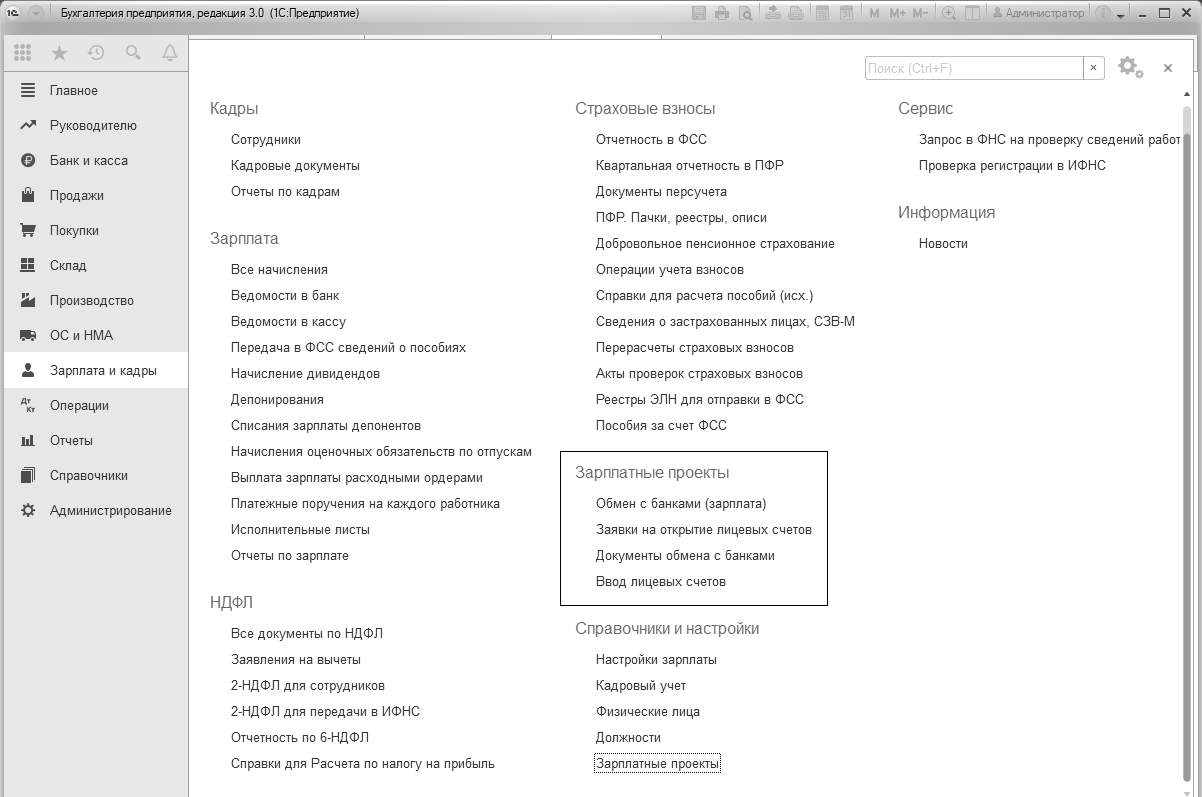 (меню "Панель разделов/Зарплата и кадры/Панель навигации/Справочники и настройки/Зарплатные проекты")