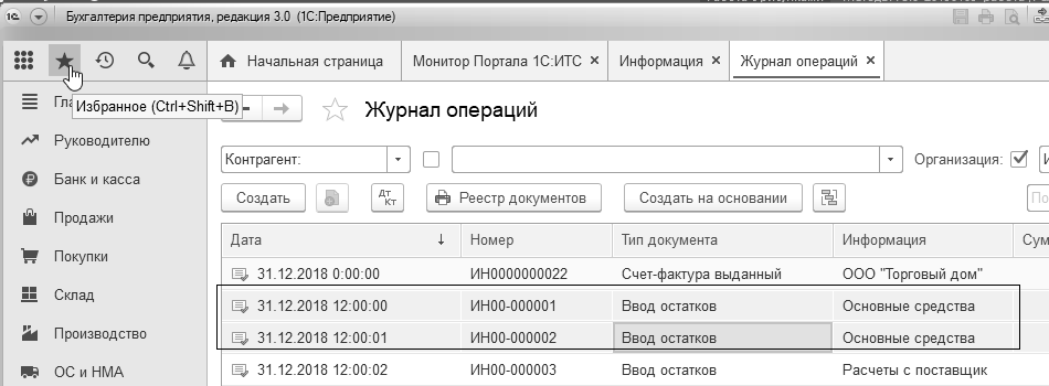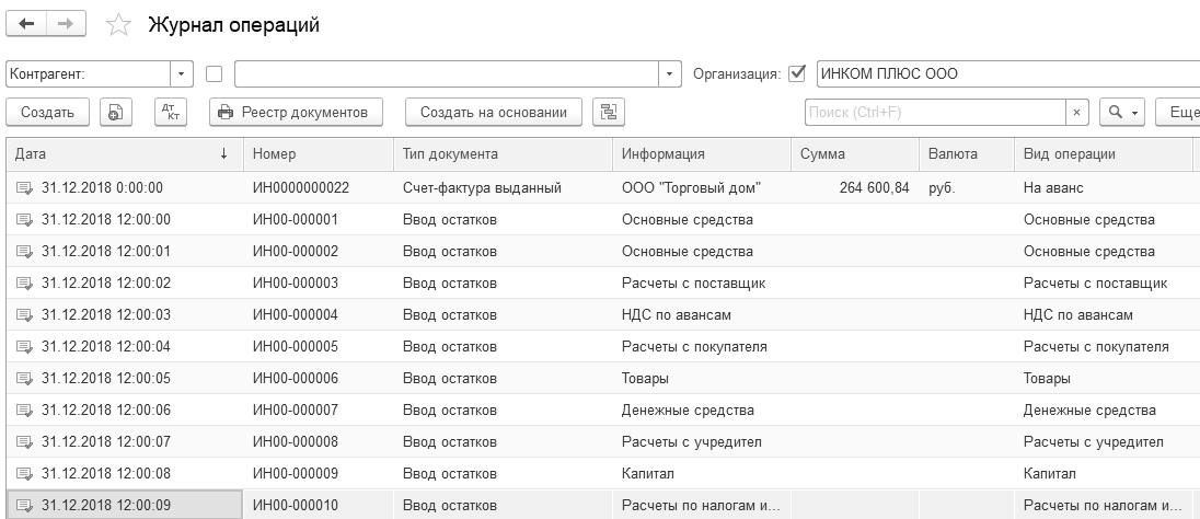 В журнале операций отображаются все операции, введенные документами конфигурации, с использованием типовой операции или вручную.