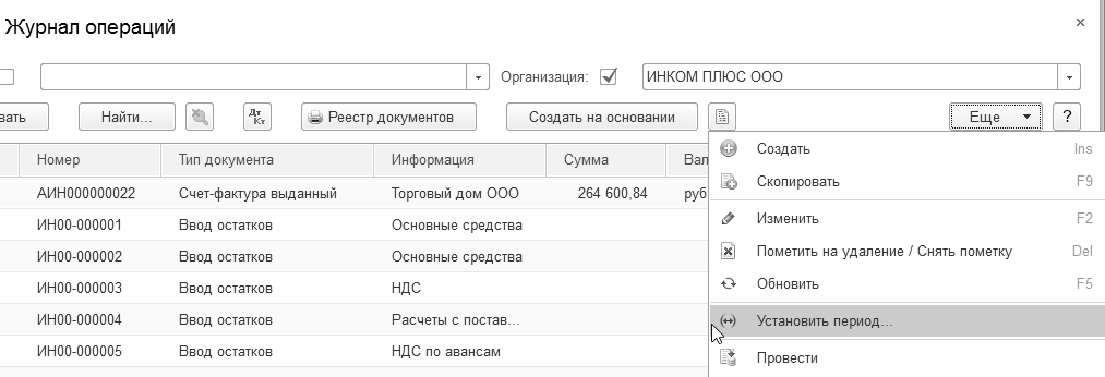 Если список операций в Журналах ограничен отчетным периодом, можно воспользоваться пунктом меню "Еще/Установить период" (рис. 5.4.2).