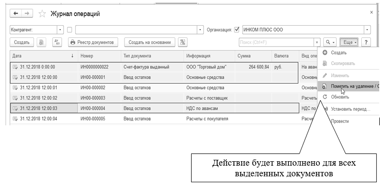 В списках документов (журналах, списках справочников) можно проводить, отменять проведение, устанавливать и снимать пометку удаления, выполнять другие действия для нескольких документов (элементов справочника) одновременно. Дополнительные обработки при этом не требуются (рис. 5.4.3).