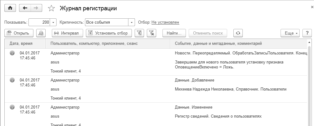 Для выполнения административных обязанностей часто требуется выяснить, какие события происходили в определенный момент времени, или какие действия выполнял тот или иной пользователь. Для этих целей предназначен журнал регистрации. В этом журнале могут фиксироваться различные события. В форме журнала регистрации в режиме использования программы отображаются события, которые можно только просмотреть.