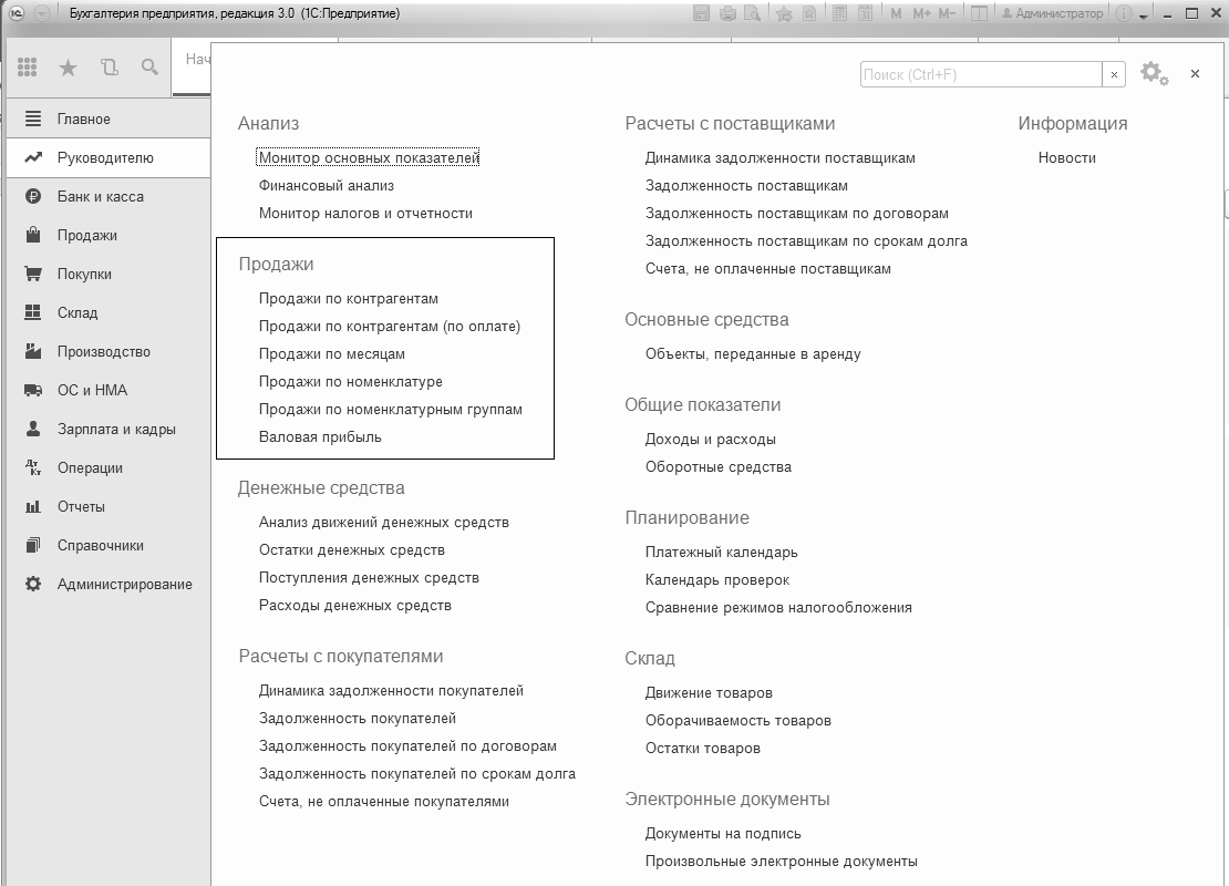 Отчеты расположены в разделе "Руководителю". Сведения, которые можно предложить руководителю в виде графиков, будут полезны для планерок, совещаний, для анализа деятельности предприятия.