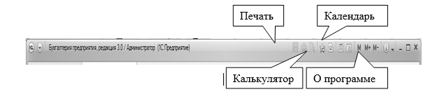 Заголовок – это самая верхняя строка окна. В заголовке главного окна программа обычно показывает название базы данных, например, "Бухгалтерия предприятия, редакция 3.0". Сюда же выведены сведения о программе, калькулятор, календарь, обращение к ссылкам (рис. 1.2.2).