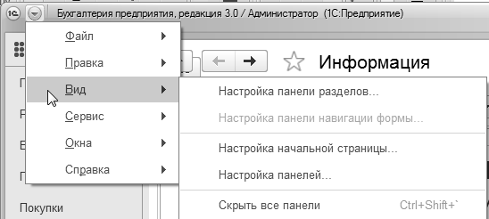 Главное меню – это сводка команд. Таких команд в программе несколько, поэтому их принято объединять в группу. При помощи кнопки главного меню можно настроить панель навигации для каждого раздела учета (рис. 1.2.3).