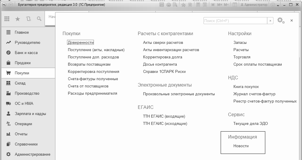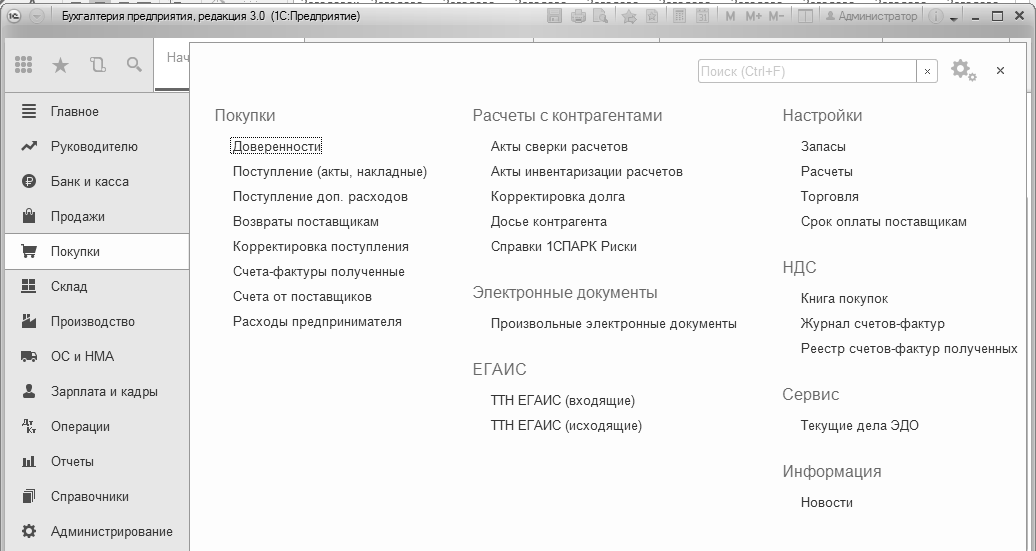 Рис. 1.2.6. Фрагмент панели меню "Покупки", сервис "Информационная система 1С:ИТС".