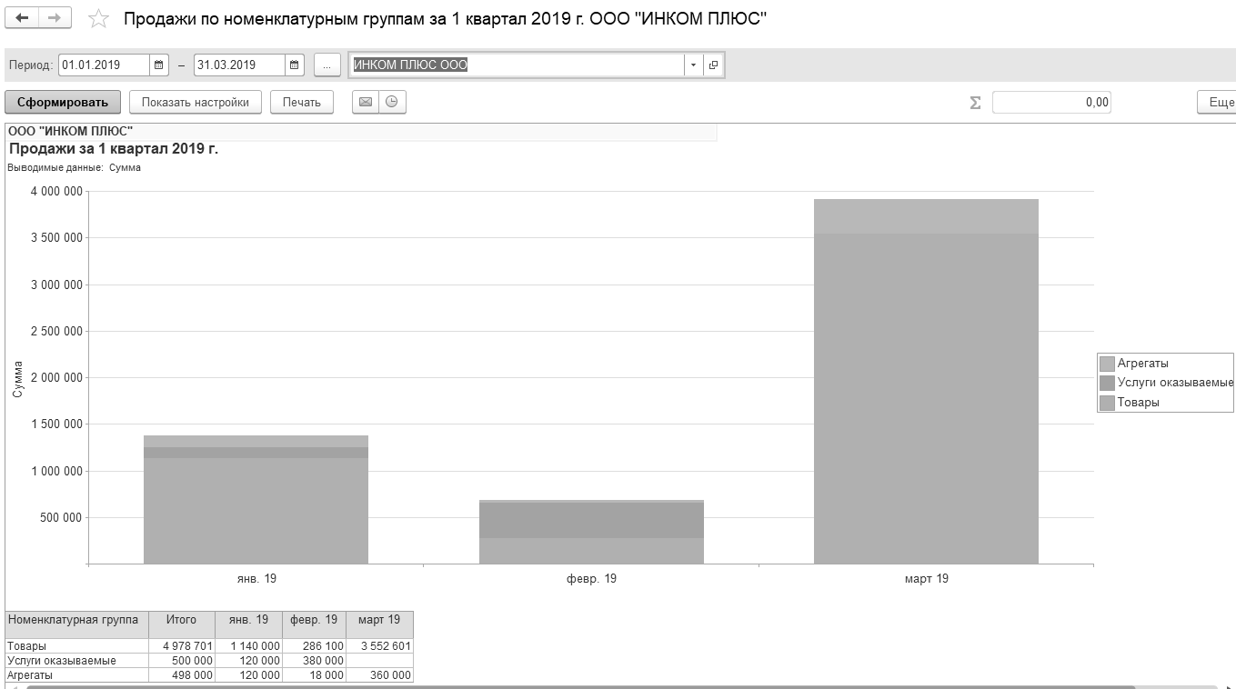 Если бы все задания методического пособия были выполнены, то график продаж условной организации "ИНКОМ ПЛЮС" по контрагентам за 1 квартал 2019 года выглядел бы так, как это представлено на рисунке 1.2.9.