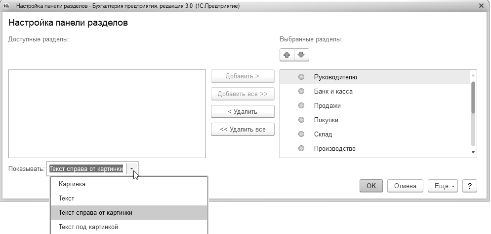 Рис. 1.2.4. Настройка панели разделов программы "1С:Бухгалтерия 8"