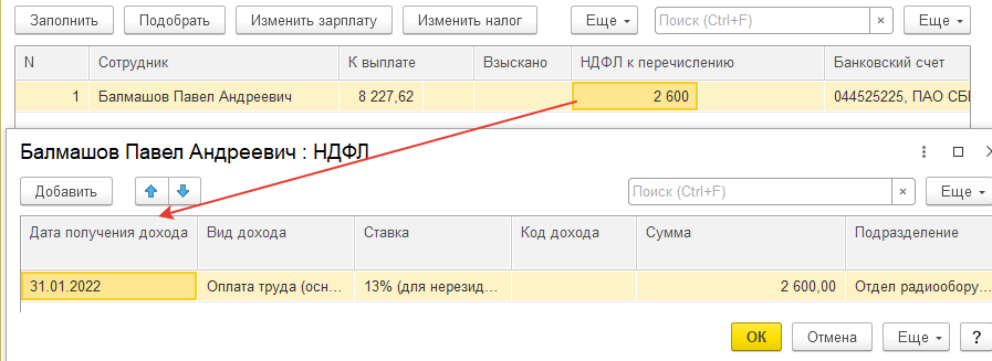 Следовательно, для каждой ведомости ООО "Авангард" на выплату зарплаты за месяц укажем реквизиты перечисления НДФЛ: для п/п № 5.