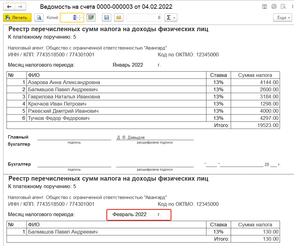 Из ведомости можно вывести на печать реестр перечислений НДФЛ. Если в разных ведомостях указан один и тот же номер платежного поручения, то при печати они будут объединяться в один реестр (независимо от того, из формы какого документа печатается отчет).