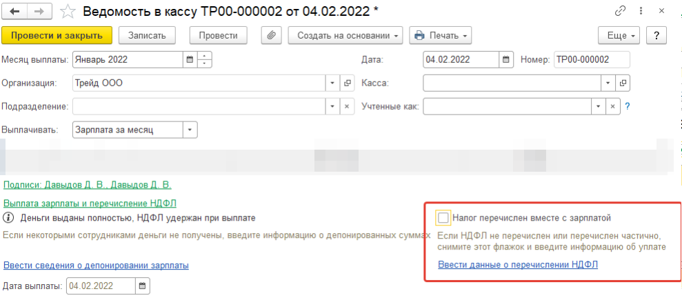 Для ведомости в кассу ООО "Трейд" флаг "НДФЛ перечислен вместе с зарплатой" снимается, суммы будут перечислены позднее.