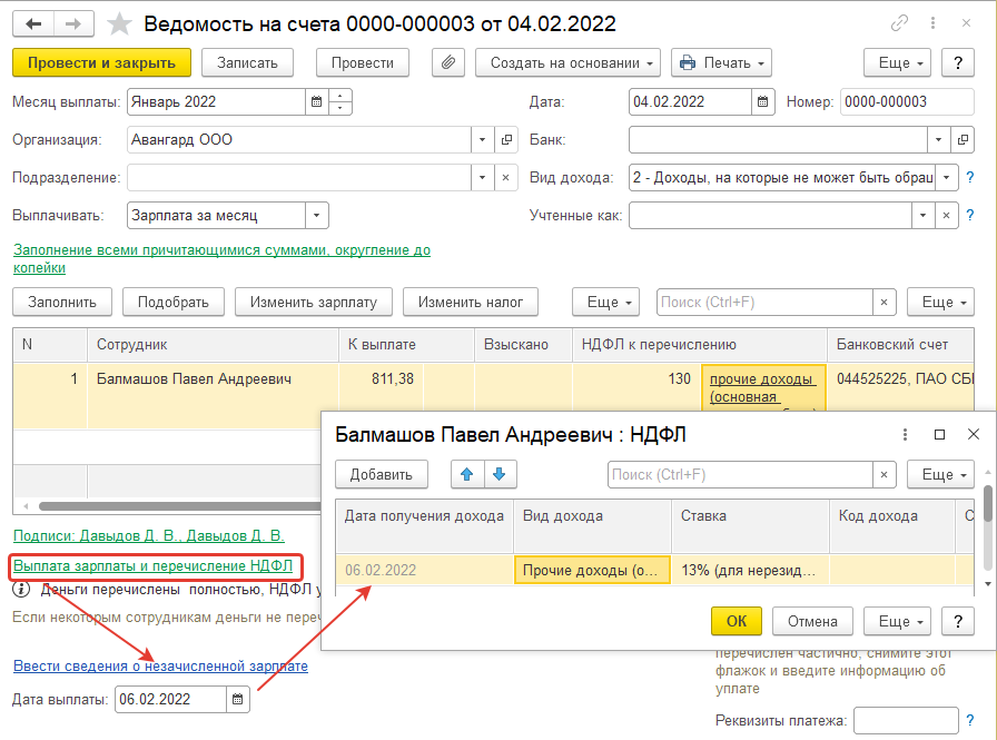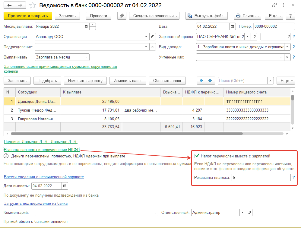 1) ООО "Авангард" – НДФЛ будет перечисляться вместе с ведомостями на выплату сумм сотрудникам, поэтому для данной организации будет использоваться способ учета НДФЛ перечисленного от ведомостей.