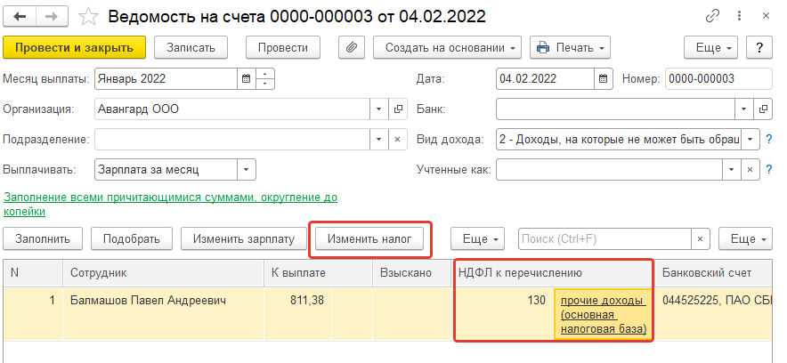 Обратите внимание, что если сотрудник не попадает в ведомость на выплату, то НДФЛ удержанный также не регистрируется (например, у сотрудника нулевая сумма к выплате (получены отпускные и аванс), однако НДФЛ к удержанию есть). Если налог требуется удержать, то, возможно, такого сотрудника следует вручную добавить в ведомость с нулевой суммой, но с удержанным налогом.