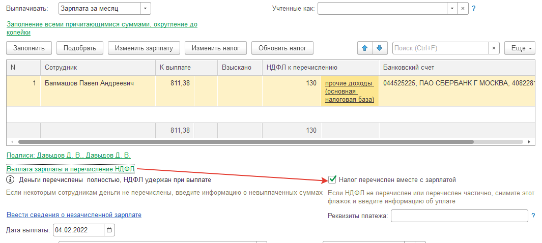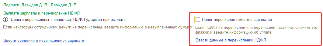 Вариант Б – если налог уплачен не полностью либо по иным причинам требуется зарегистрировать перечисление на другую дату, то флаг "НДФЛ перечислен вместе с зарплатой" следует снять.