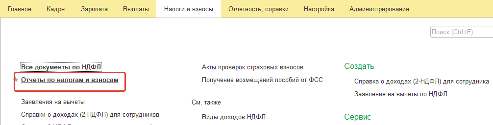 Для анализа начисленных сумм по НДФЛ и страховым взносам также используются отчеты. Доступ к ним осуществляется из раздела "Налоги и взносы / Отчеты по налогам и взносам".