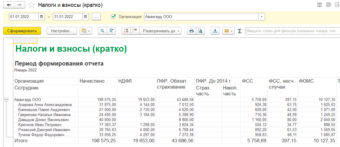 Отчет "Налоги и взносы (кратко)" позволяет вывести общие суммы начисленного НДФЛ, а также страховых взносов в целом по организации и по каждому сотруднику за выбранный период (это фактически оборот по кредиту 68 и 69 счетов в бухгалтерии, если за месяц не было каких-либо особенностей – возврата платежных поручений, ручных корректировок и т.д.). Это данные бухгалтерского учета.