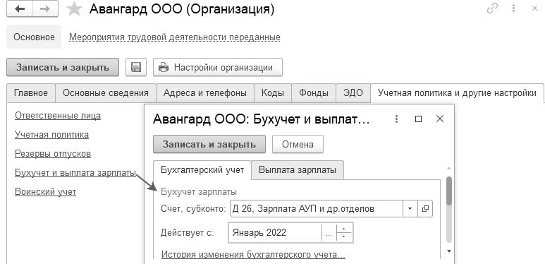 1.Откроем из раздела "Настройка/Организации" карточку организации ООО "Авангард". В разделе "Учетная политика и другие настройки" по ссылке "Бухучет и выплата зарплаты" укажем способ отражения по умолчанию – на 26 счет.