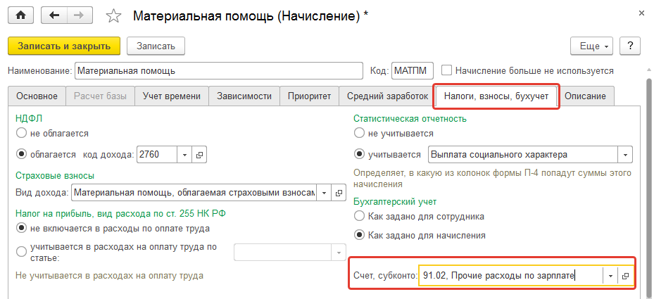 Откроем в разделе "Настройка/ Начисления" список начислений программы. На закладке "Налоги, взносы, бухучет" для всех видов материальной помощи установим способ отражения в учете – Прочие расходы по зарплате, 91счет.