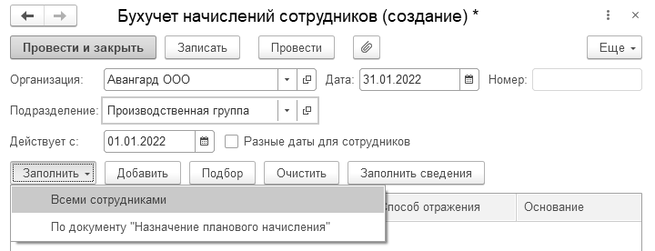 Документ можно заполнять произвольным списком сотрудников либо по документу "Назначение планового начисления".