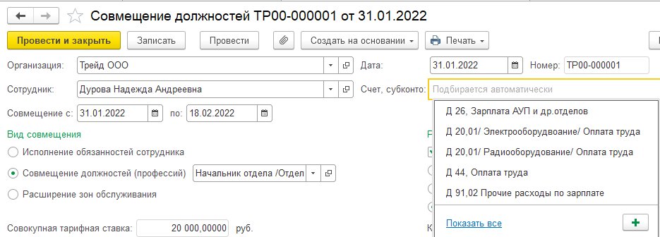 - Совмещение должностей; Назначение планового начисления;