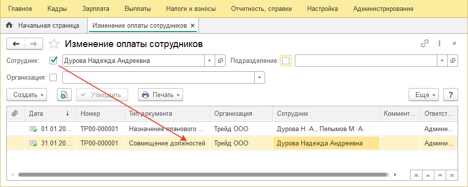 Откроем в разделе "Зарплата/ Изменение оплаты труда" список документов по постоянным начислениям. Найдем документ "Совмещение должностей" сотрудницы ООО "Трейд" Дуровой Н.А.