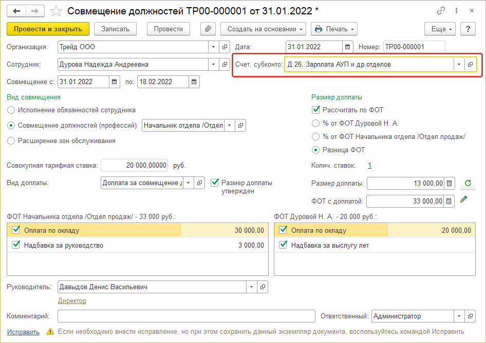 Однако совмещает она за начальника отдела продаж, зарплата которого относится на 26й счет. Для целей бухгалтерского учета принято решение отражать доплату за совмещение на 26м счете.