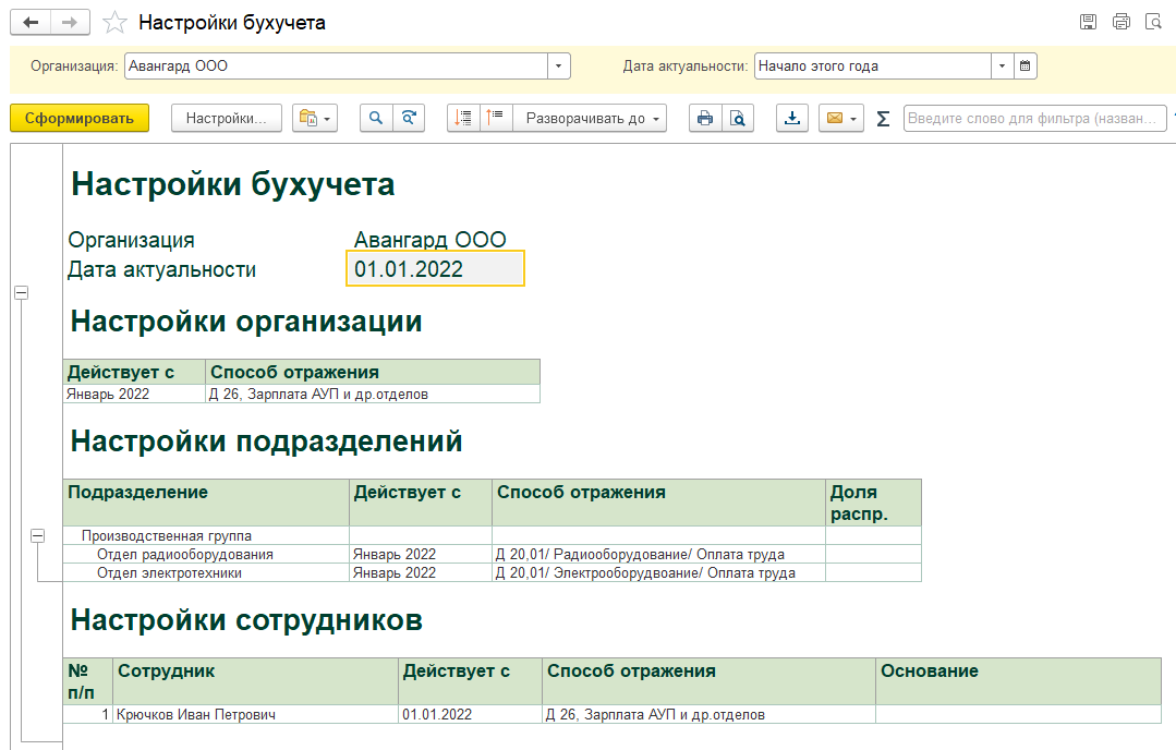 Просмотреть и проанализировать настройки по организации можно с помощью отчета Настройки бухучета (в разделе "Зарплата – Отчеты по зарплате"). Настройки показаны в порядке приоритетностию. Обратите внимание на то, что настройки начислений в этом отчете не отображаются.